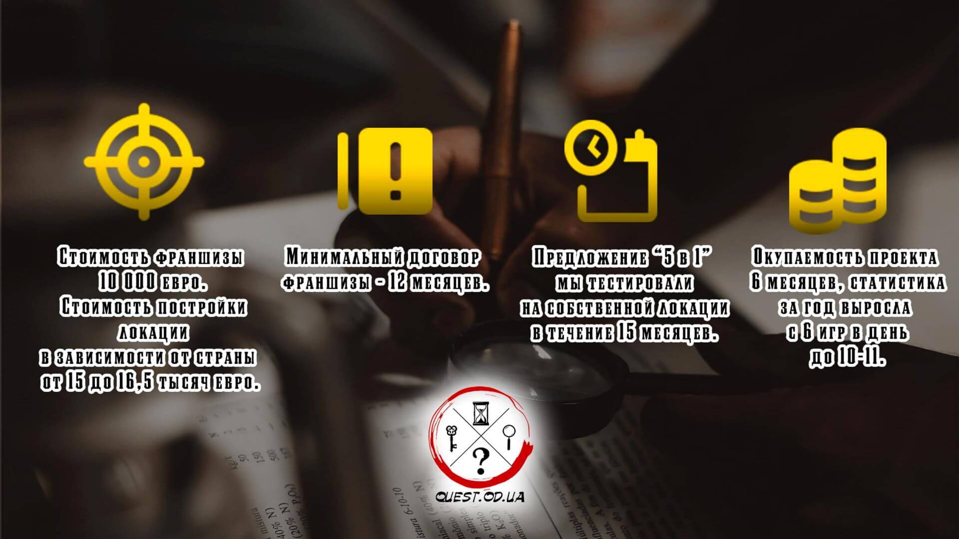 Аналогов данному предложению на рынке нет, что делает её рентабельной, и франшиза квест комнаты становится выгодной для вас!